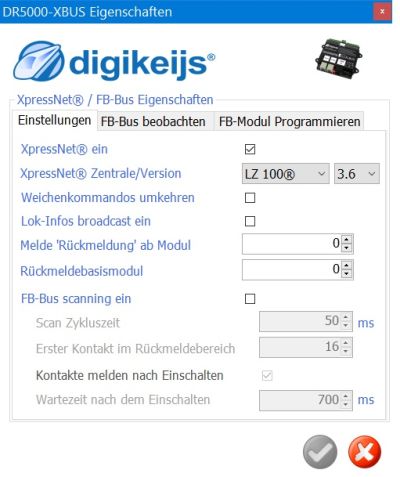 Damit die Loconetmelder Adresse 1-1 auch im Xpressnet als 1-1 an TC übertragen wird, müssen in der DR5000 unter XN-Bus die folgenden Einstellungen gesetzt werden:
