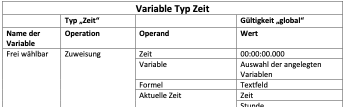 Die Tabelle beinhaltet Objekt-; Zahl-; Text- und Zeitvariablen mit den zugehörigen Operationen, deren Operant und dem Wert.