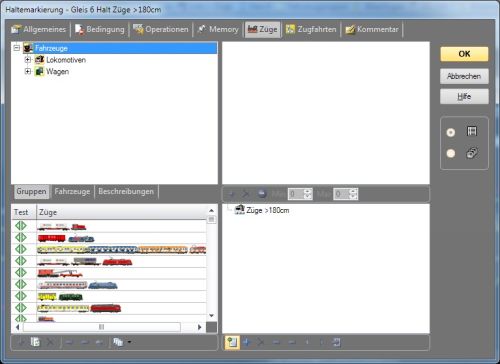 Im Bereich links unten können testweise Zugverbände zusammengestellt werden. Mit grünen und roten Markierungen wird dann angezeigt, ob die Zugbeschreibung auf diesen Zugverband zutrifft oder nicht. Auf diese Weise kann die Gültigkeit einer Zugbeschreibung sehr komfortabel getestet werden.